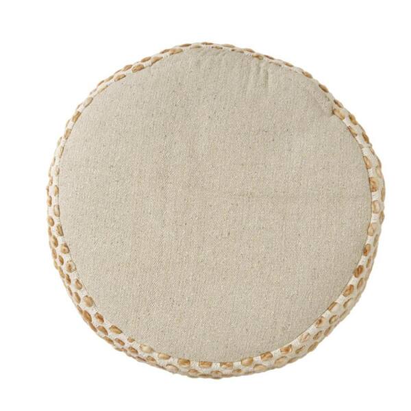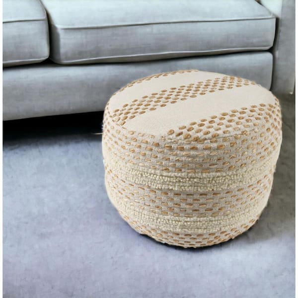 Ivory and Brown Fabric Round Accent Ottoman