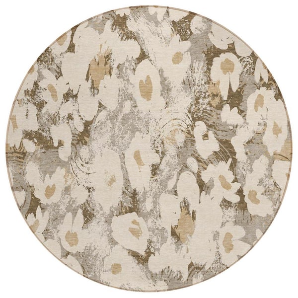 Khaki 8 ft. Round Woven Floral Round Indoor/Outdoor Area Rug