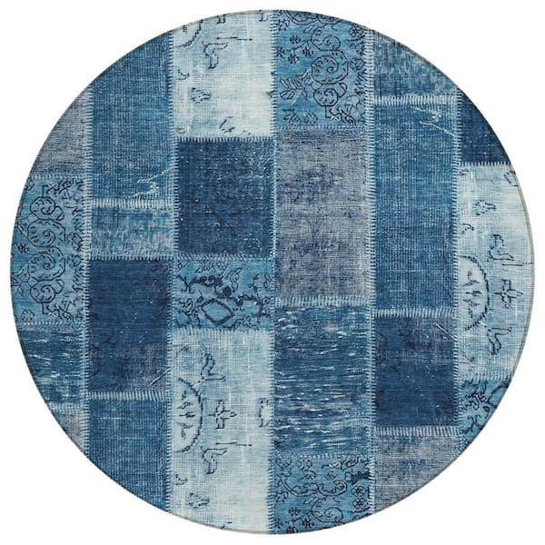 Navy Blue, Sky Blue 8 ft. Round Woven Plaid Polyester Round Indoor/Outdoor Area Rug