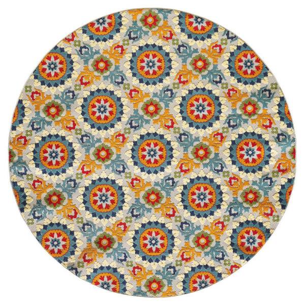 Orange, Ivory 8 ft. Round Woven Polypropylene Round Indoor/Outdoor Area Rug