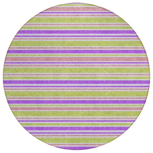 Purple, Green, Pink 8 ft. x 8 ft. Woven Striped Polyester Round Indoor / Outdoor Area Rug