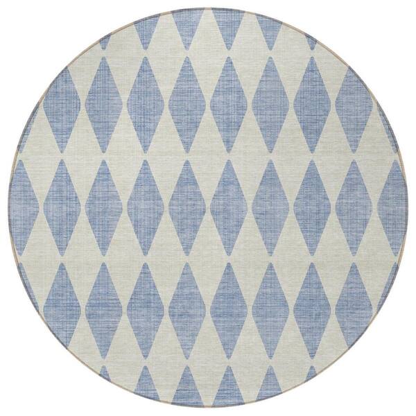 Sky Blue, Ivory 8 Round ft. Woven Geometric Polyester Round Indoor / Outdoor Area Rug