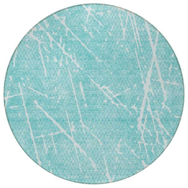 Teal Blue, Ivory 8 ft. Round Woven Abstract Polyester Round Indoor/Outdoor Area Rug
