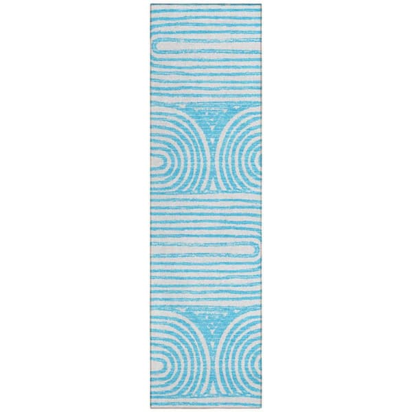 Teal Blue, White 2 ft. x 8 ft. Woven Abstract Polyester Runner Indoor / Outdoor Area Rug