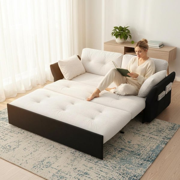 Artisc 74 in. Snow White Chenille 3-in-1 Queen Size Sleeper Sofa Bed with Adjustable Armrests and Side Storage