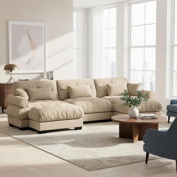BLASTAR 130 in. Velvet 3-Seater Sectional Sofa with Round Bolster Arms and Modular Ottoman in Camel Brown