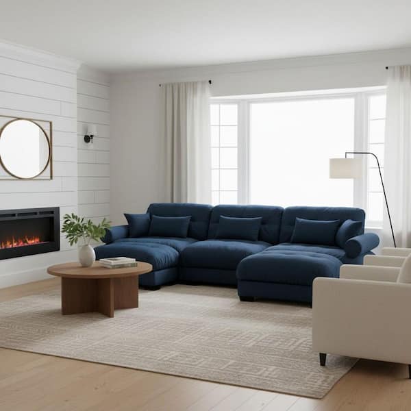 BLASTAR 130 in. Velvet 3-Seater Sectional Sofa with Round Bolster Arms and Modular Ottoman in Sapphire Blue