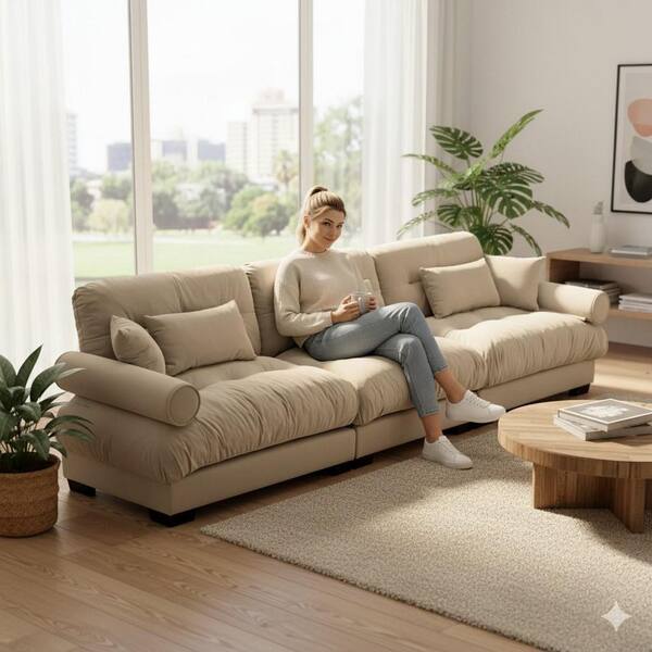 BREAD 130 in. Rolled Arm Velvet 3-Seater Rectangle Cloud Look Sofa with Bolster Armrests and Deep Seats in Camel Brown