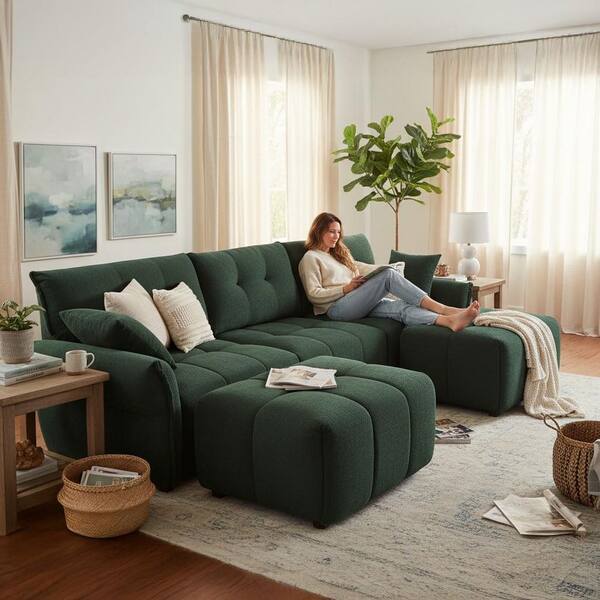 FAKCH 110 in. Modular U-Shaped Chenille 5-Seater Sectional Sofa with Ottoman, Deep Seat, Tufted Back in Emerald Green