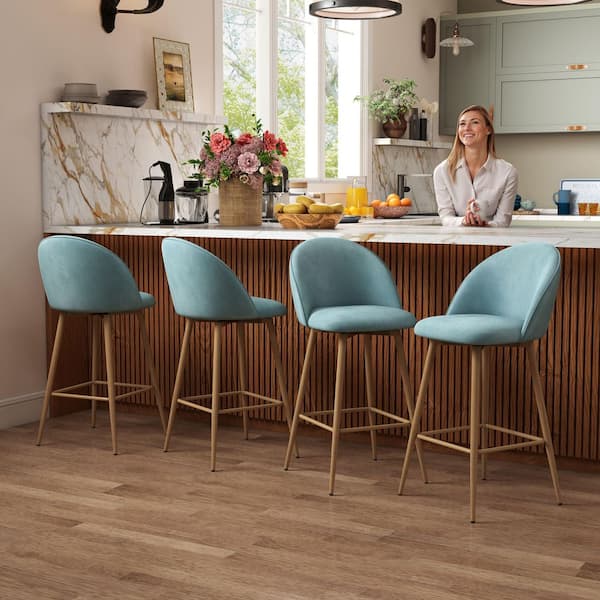 Haseeb 26 in. Modern Swivel Upholstered Counter Height Bar Stool with Curved Back, Pale Teal Fabric/Oak Legs, (Set of 4)