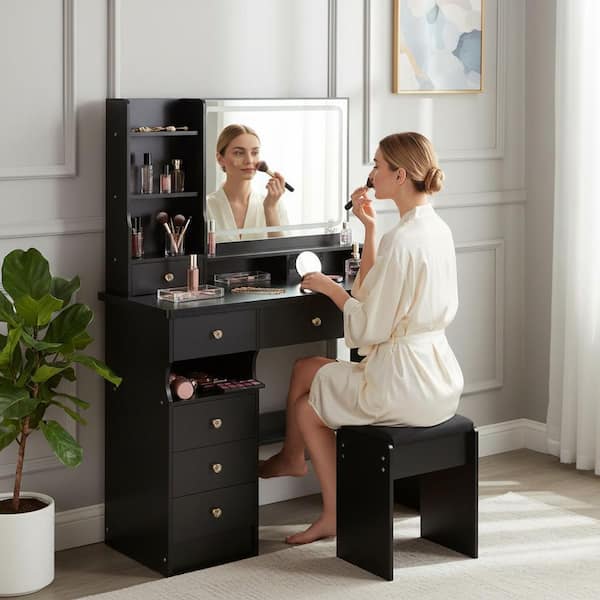 Mory 41 in. Black Makeup Vanity Set with Lighted Mirror, Power Outlet, USB Ports, 7-Drawers and Stool