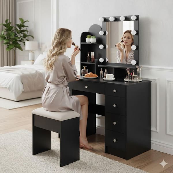 PERRLY 5-Drawers Onyx Black Makeup Vanity Set with Mirror, Stool, LED Lights, Charging Station and 5 Open Shelves