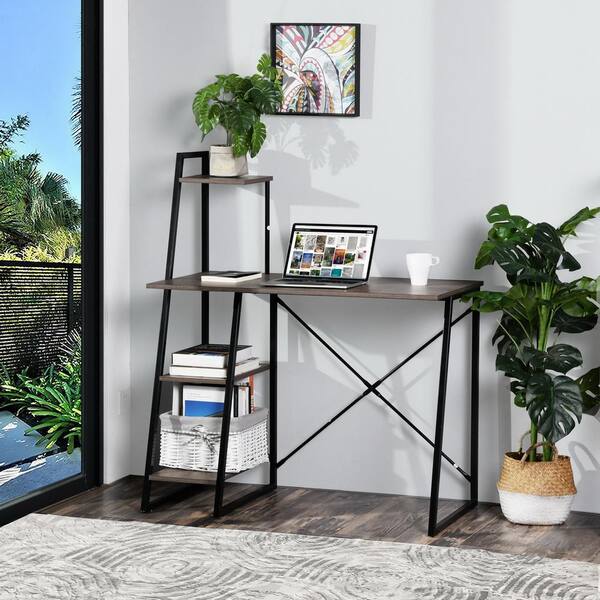 POUCHU 41 in. Rectangular Walnut Wood Computer Desk with Shelves
