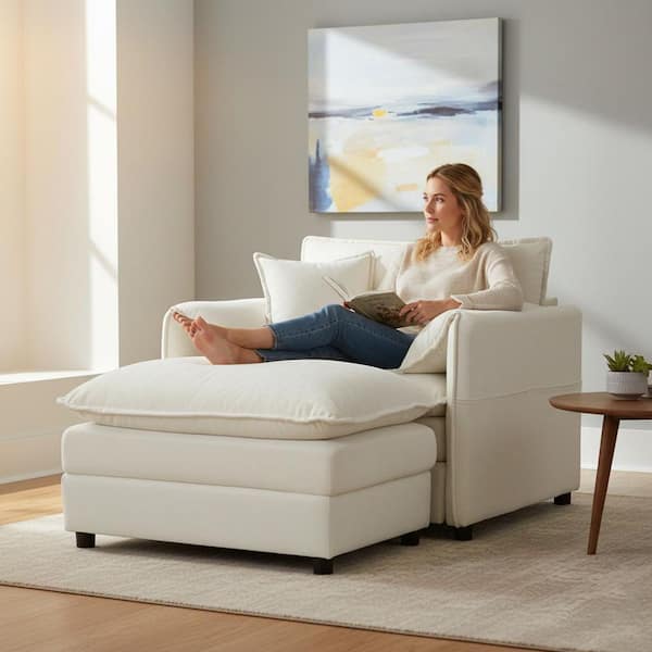 RKYI 57.5 in. Cream Beige Chenille Oversized Accent Chair in Deep Seat, Cushioned Arms with Pillow and Modular Ottoman