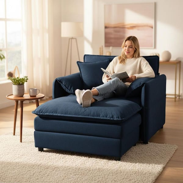 RKYI 57.5 in. Midnight Blue Chenille Oversized Accent Chair in Deep Seat, Cushioned Arms with Pillow and Modular Ottoman
