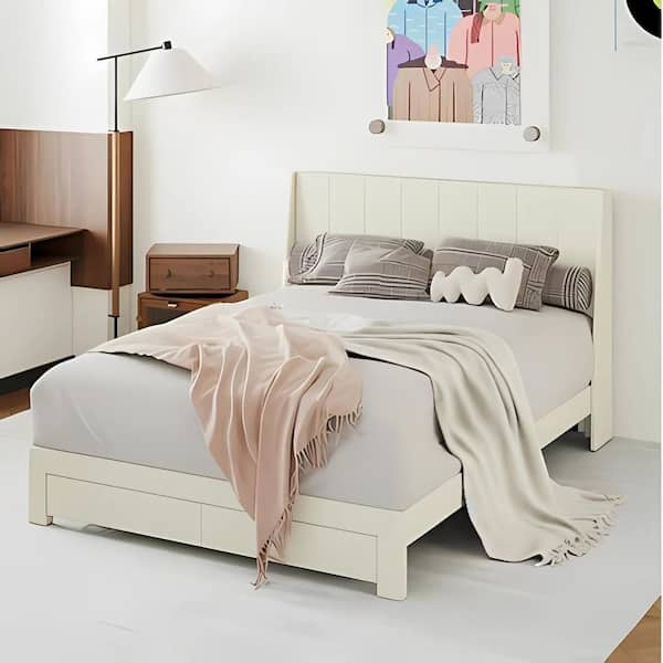 SUMMIT Queen Beige Upholstered Platform Bed with Wingback Headboardand, Metal Frame, Charging Ports and Storage Drawer