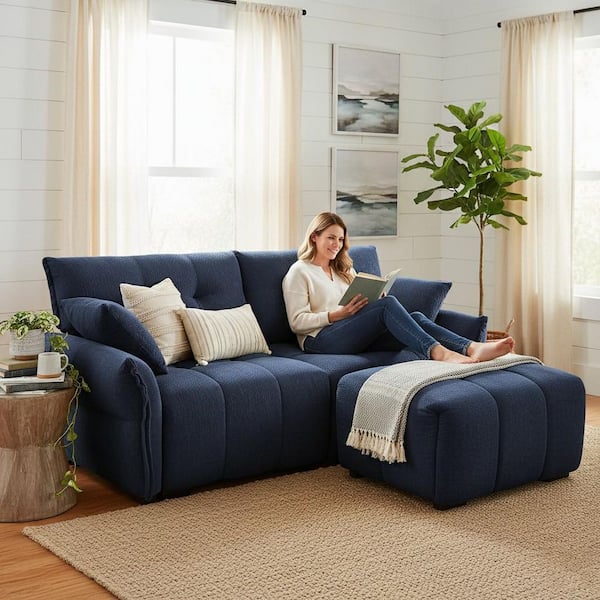 YOYO 78.7 in. Rolled Arm Chenille 3-Seater L-Shaped Tufted Sectional Sofa with Ottoman and Deep Seats in Midnight Blue