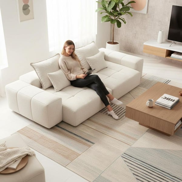 YSLN 113 in. Modular Tufted Chenille 4-Seater Sectional Sofa in. Ivory White with Luxe Sparkle Fabric and No-Assembly