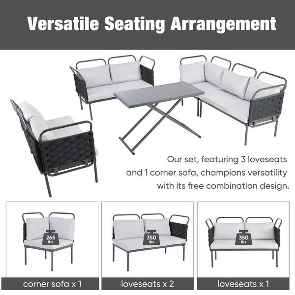 5-Piece Modern Black Metal Outdoor Sectional Set Patio Conversation with Woven Rope and Gray Cushions and Glass Table