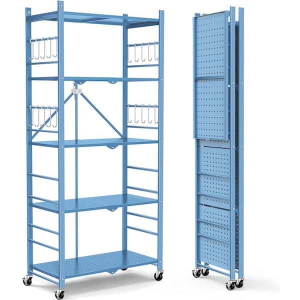 5-Tier Collapsible Storage Shelves Folding Pantry Shelves Wire Shelving in Blue with 20-Hooks for Garage Kitchen Room