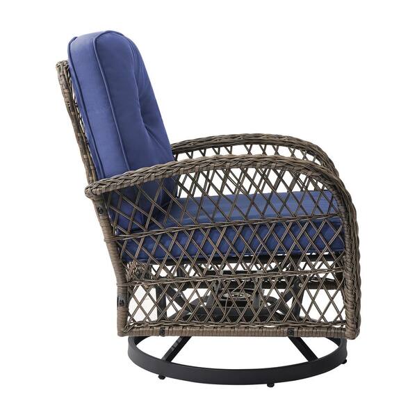 Kovach 3-Piece PE Wicker Patio Conversation Set with Navy Blue Cushion Rattan Swivel Rocking Chair and Side Table
