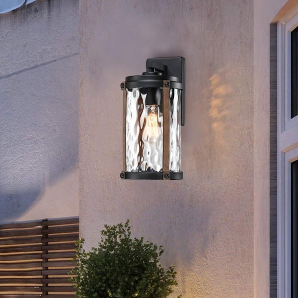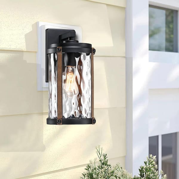 13.9 in. H 1-Light Matte Black Hardwired Outdoor Wall Lantern Sconce with and Barnwood accents