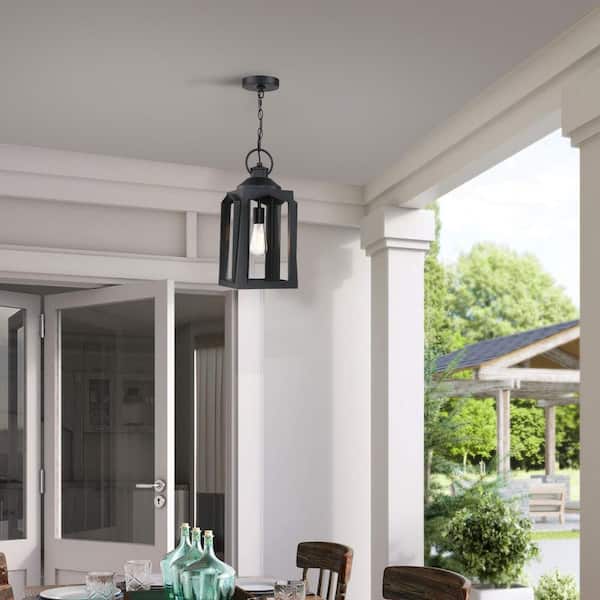 19 in. 1-Light Matte Black Outdoor Pendant Light with Clear Glass Shade