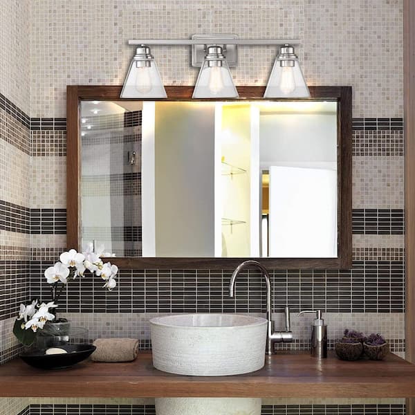 26 in. 3-Light with Brushed Nickel And Vanity Light Clear Glass Shade and Bath Set (5-Piece)