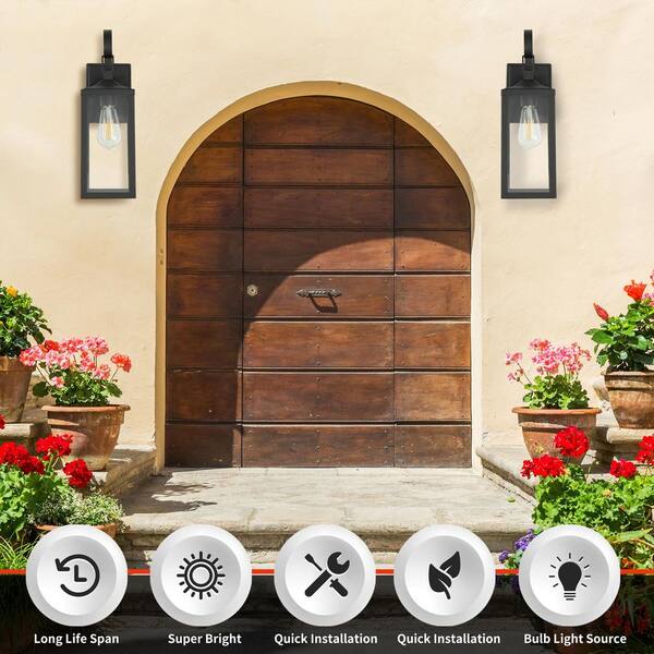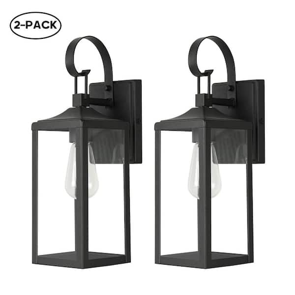 Castle 1-Light 16 in. Outdoor Hardwired Wall Lantern Sconce with Matte Black Finish and Clear Glass Shade(2-Pack)