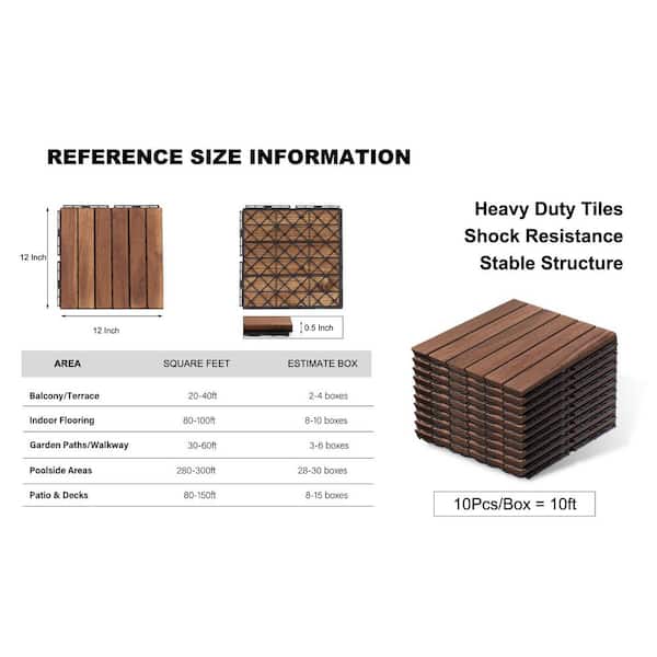 12 in. x 12 in. Square Solid Wood Striped Pattern Patio Deck Tiles, Brown (10-Pieces)