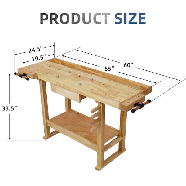55 in. W x 19.5 in. D Yellow Workbench Table with Solid Wood Top and 1-Drawer for Garage Workshop and Home