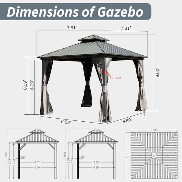 8 ft. x 8 ft. Gray Heavy Duty Aluminum Metal Gazebo with Galvanized Steel Double Roof Canopy, Curtain and Netting