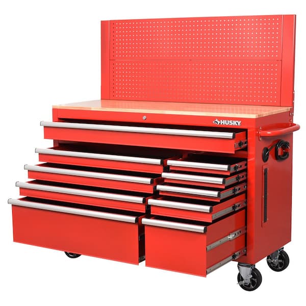 52 in. W 10-Drawer Gloss Red Mobile Workbench Cabinet with Solid Wood Top and Pegboard