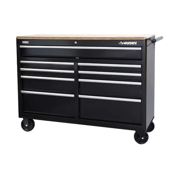 52 in. 9-Drawer Mobile Workbench with Solid Wood Top, Black