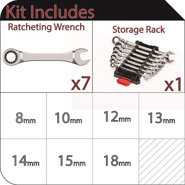 • Wrench set includes 7 metric ratcheting combination wrenches