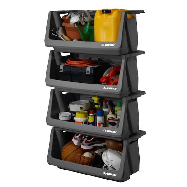 • Stackable bins are ideal for garage or basement storage