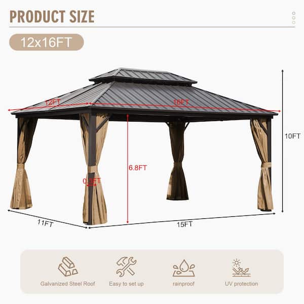 12 ft. x 16 ft. Aluminum Hardtop Gazebo with Double Galvanized Steel Roof, Netting and Curtains for Patio and Backyard