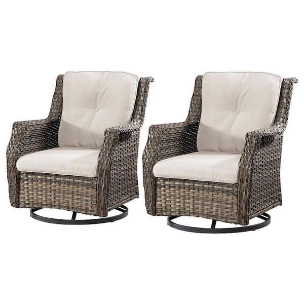 2-Piece Outdoor Patio Wicker Lounge Chair Swivel Rocking Chair with Beige Cushions