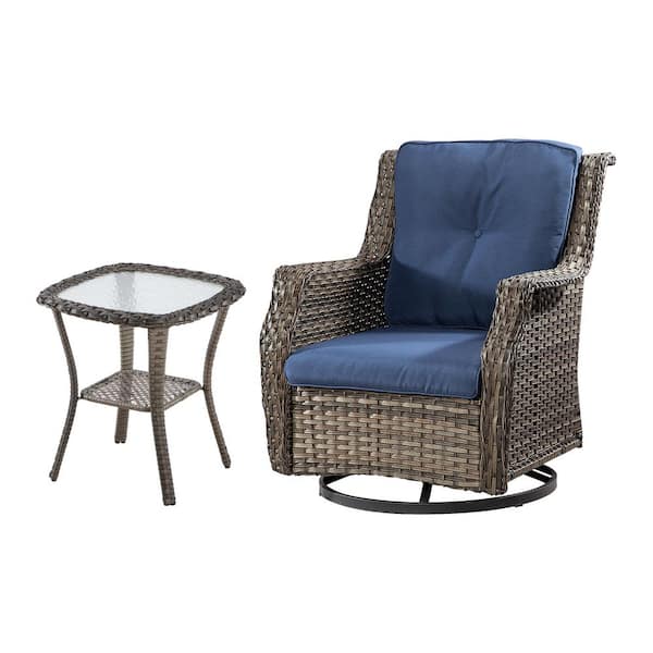 2-Piece Wicker Patio Lounge Chair and Glass Side Table Set with Swivel Rocker and Blue Cushions