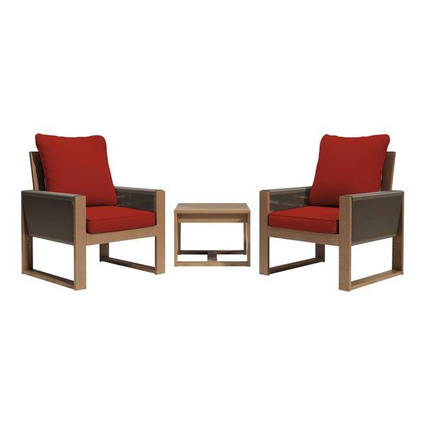 3-Piece Canadian Hemlock Wood Outdoor Lounge Chair Patio Conversation Set with Red Cushions