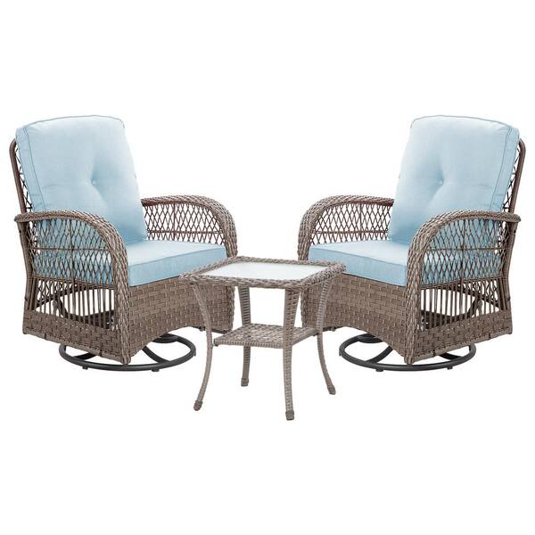 3-Piece Patio Wicker Conversation Set with Baby Blue Cushions and Side Table - Swivel, Rock, and Relax in Style