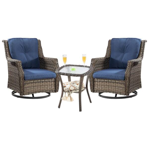 3-Piece Patio Wicker Conversation Set with Blue Cushions and Side Table - Swivel, Relax in Style