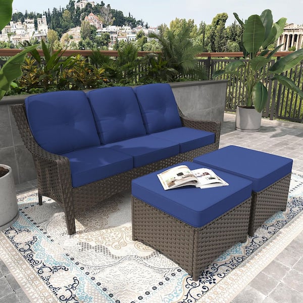 3-Piece Wicker Outdoor Sofa Couch Set with Blue Cushions and Matching Ottomans