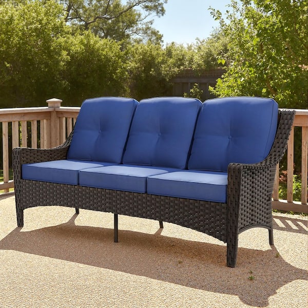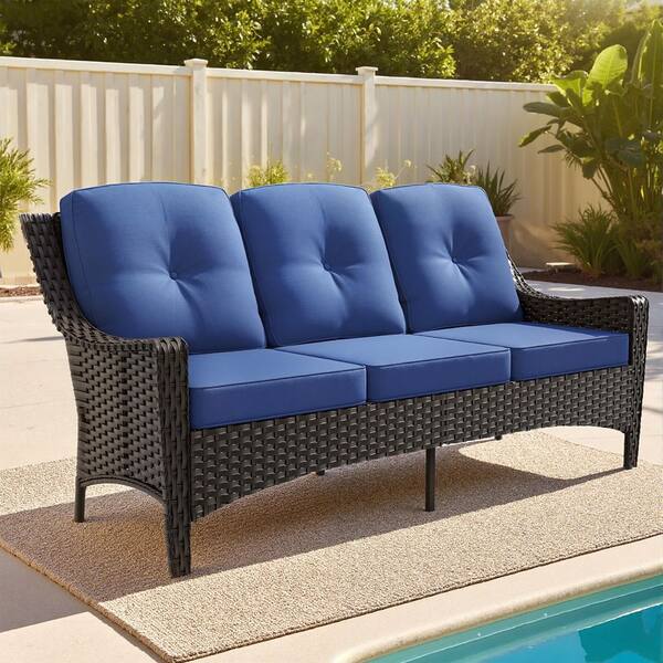 3-Seat Wicker Outdoor Patio Sofa Sectional Couch with Blue Cushions