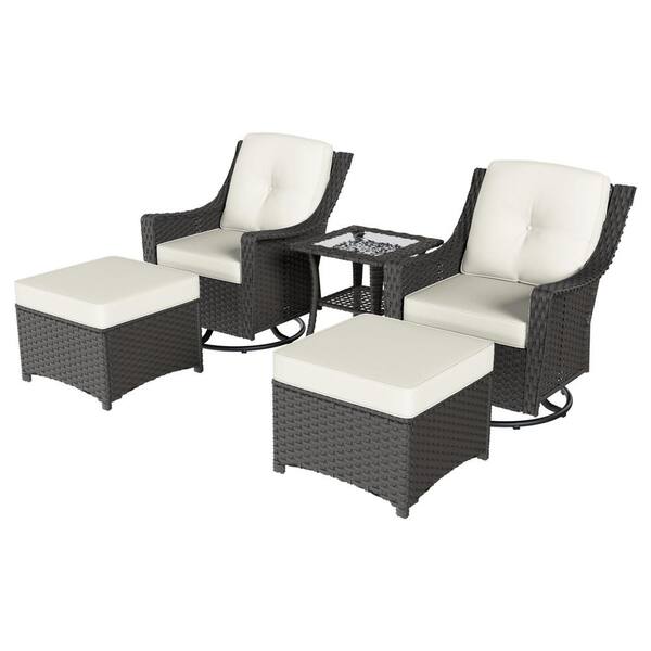 5-Piece Outdoor Wicker Conversation Set with Beige Cushions, Footstool. Side Table