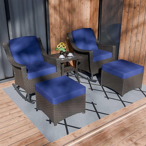 5-Piece Wicker Outdoor Patio Conversation Set Rocking Chair Set with Blue Cushions