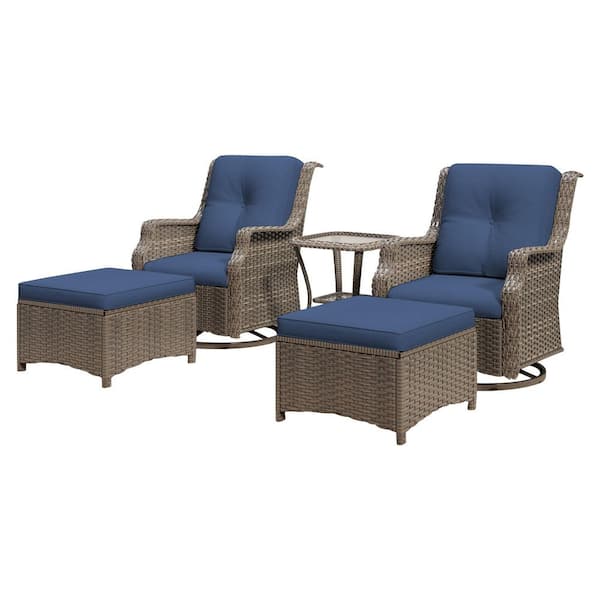 5-Piece Wicker Patio Lounge Chair Set with Swivel Rockers, Ottomans, and Glass Side Table and Blue Cushions Chat Set