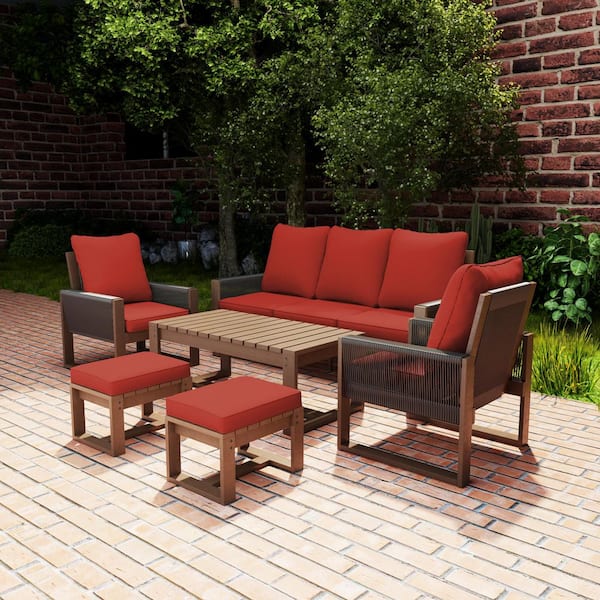 6-Piece Canadian Hemlock Wood Outdoor Conversation Set with Ottomans Red Cushion