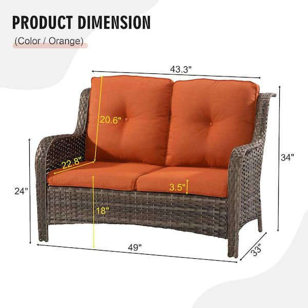 Brown Wicker Outdoor Patio Deep Seating Loveseat Couch with Orange Cushions