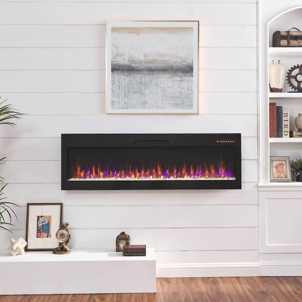 60 in. D Black Electric Fireplace, Recessed and Wall Mounted Fireplace